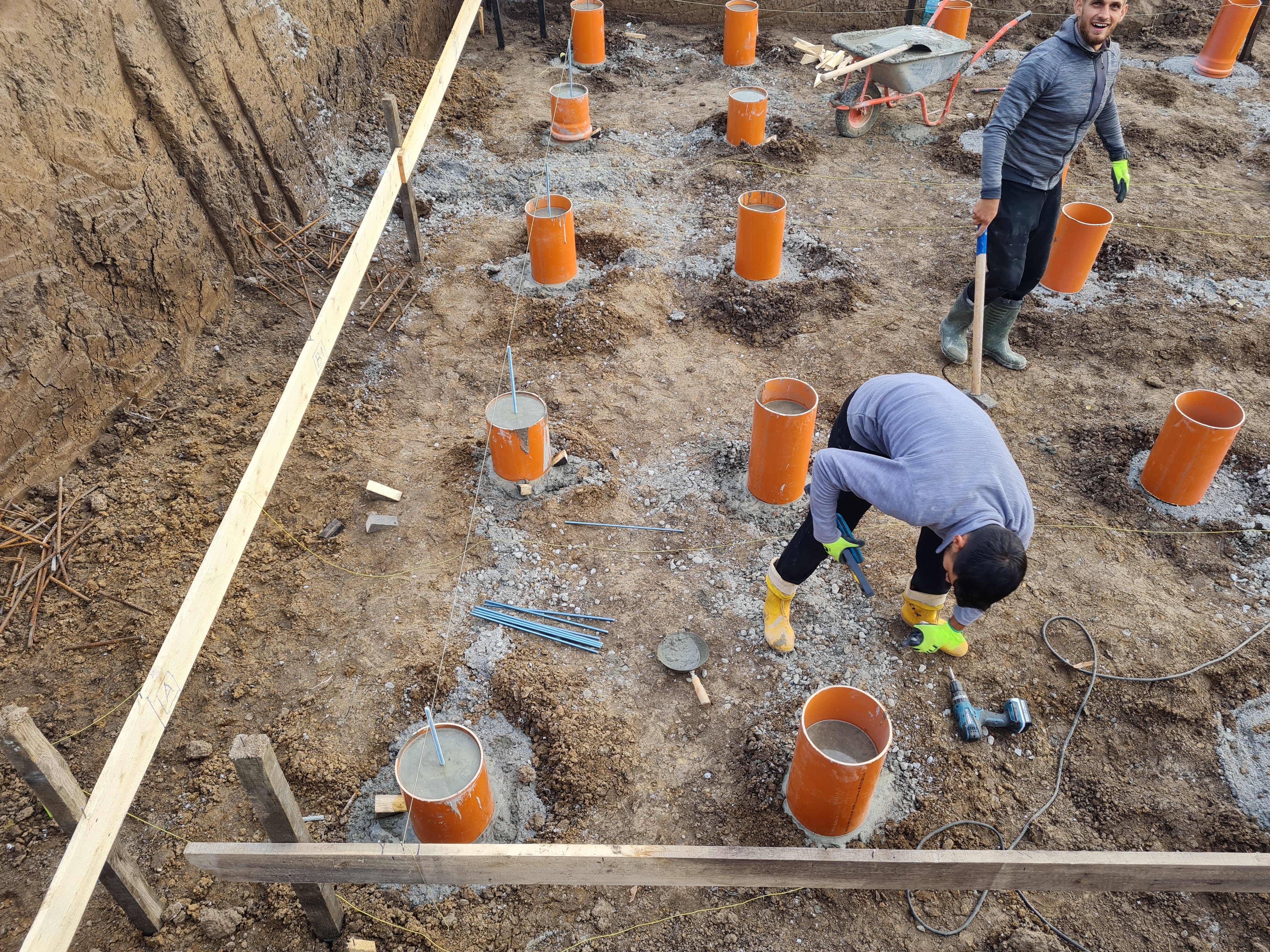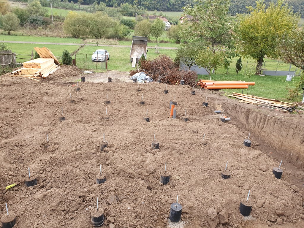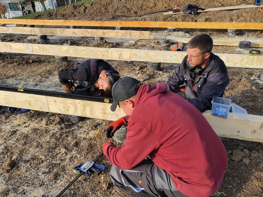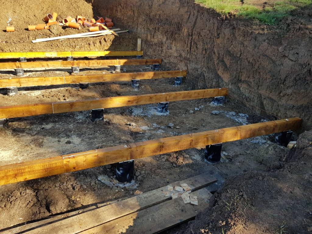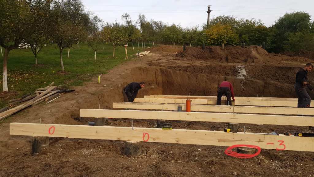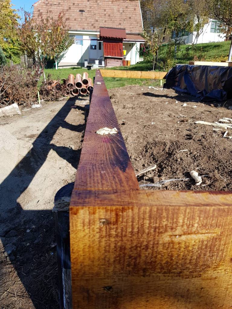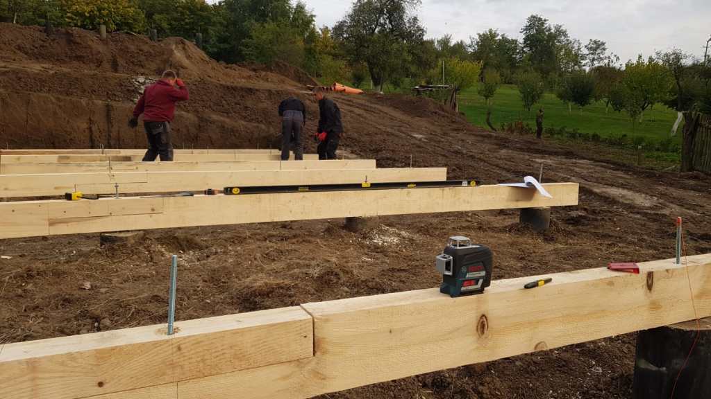 In acest punct am ajuns sa montam grinzile de lemn peste pilonii de fundare , grinzi de lemn cu dimensiunea de 15 x 20 cm, prinse cu tije filetate, direct in pilonii de beton armat din elevatia de peste fundatie.